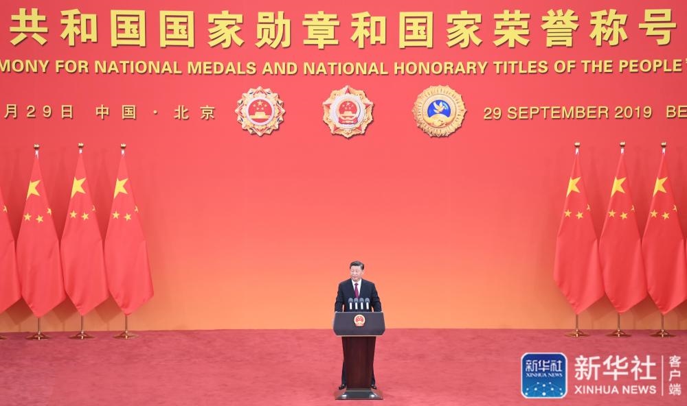 ↑9月29日,中華人民共和國(guó)國(guó)家勛章和國(guó)家榮譽(yù)稱(chēng)號(hào)頒授儀式在北京人民大會(huì)堂金色大廳隆重舉行。中共中央總書(shū)記、國(guó)家主席、中央軍委主席習(xí)近平向國(guó)家勛章和國(guó)家榮譽(yù)稱(chēng)號(hào)獲得者頒授勛章獎(jiǎng)?wù)虏l(fā)表重要講話。新華社記者黃敬文攝
