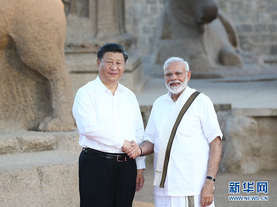 10月11日,國家主席習近平在金奈會見印度總理莫迪。這是習近平在莫迪陪同下參觀馬哈巴利普拉姆古寺廟群。