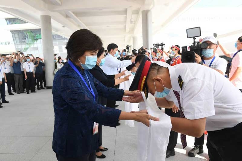 自治區(qū)黨委副書(shū)記、自治區(qū)主席布小林宣布赤喀高鐵正式開(kāi)通運(yùn)營(yíng),并與自治區(qū)副主席艾麗華、自治區(qū)政府秘書(shū)長(zhǎng)包振玉以及中國(guó)鐵路沈陽(yáng)局集團(tuán)有限公司、蒙遼鐵路客運(yùn)專線有限責(zé)任公司、赤峰市委負(fù)責(zé)同志一起為列車(chē)組人員敬獻(xiàn)哈達(dá)。