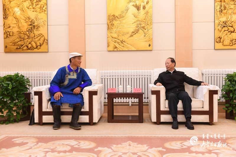7月29日,自治區(qū)黨委書記、人大常委會(huì)主任石泰峰在主持召開草原生態(tài)保護(hù)補(bǔ)助獎(jiǎng)勵(lì)政策實(shí)施情況專題匯報(bào)會(huì)前,會(huì)見自治區(qū)人大代表浩畢斯嘎拉圖。內(nèi)蒙古日?qǐng)?bào)記者袁永紅攝