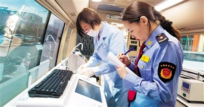 市場監(jiān)督管理局的檢測人員正在對食品進(jìn)行檢查。
