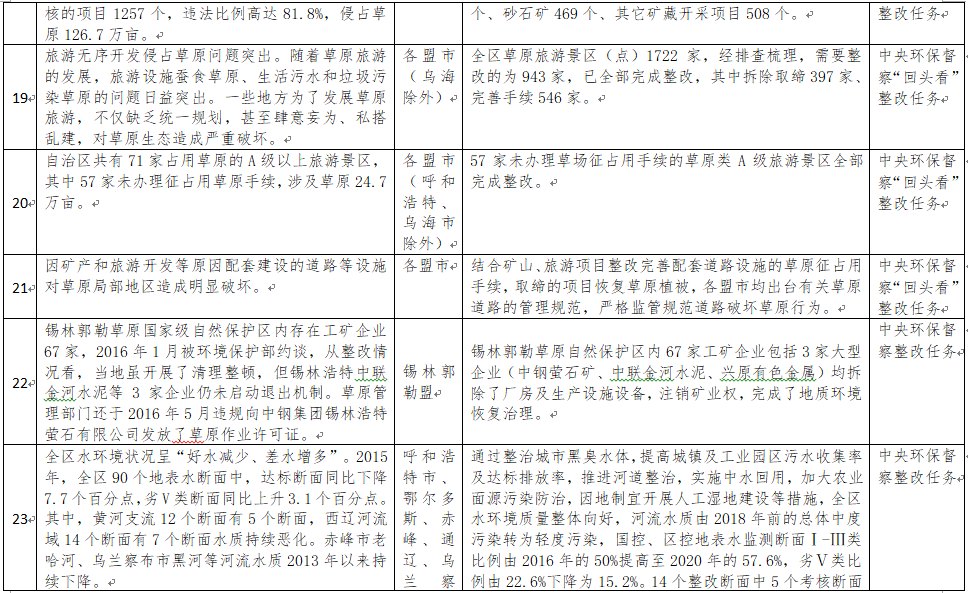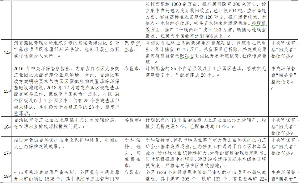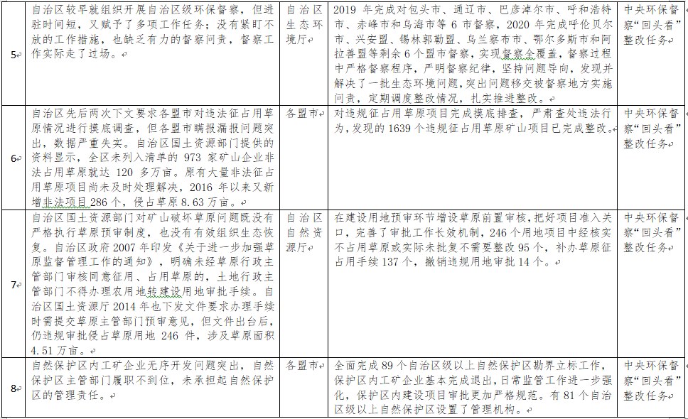 中央環(huán)境保護(hù)督察以來(lái),自治區(qū)各級(jí)黨委政府及相關(guān)部門(mén)高度重視反饋意見(jiàn)整改工作,貫徹落實(shí)習(xí)近平生態(tài)文明思想的自覺(jué)性和主動(dòng)性顯著增強(qiáng),采取強(qiáng)有力措施積極推動(dòng)整改工作,整改工作取得階段性成果。近期部分整改任務(wù)已通過(guò)自治區(qū)相關(guān)委辦廳局驗(yàn)收,現(xiàn)予以公示,公示期2021年2月5日至2月9日,未提出異議的整改任務(wù)給予銷(xiāo)號(hào)(聯(lián)系電話(huà):0471-4632171)。