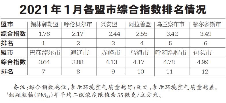 按照常規(guī)六項污染物綜合指數(shù)排名, 12個盟市環(huán)境空氣質(zhì)量由好至差依次為:錫林郭勒盟、呼倫貝爾市、興安盟、阿拉善盟、烏蘭察布市、鄂爾多斯市、巴彥淖爾市、通遼市、赤峰市、烏海市、呼和浩特市和包頭市。(內(nèi)蒙古日報社融媒體記者 梁亮)