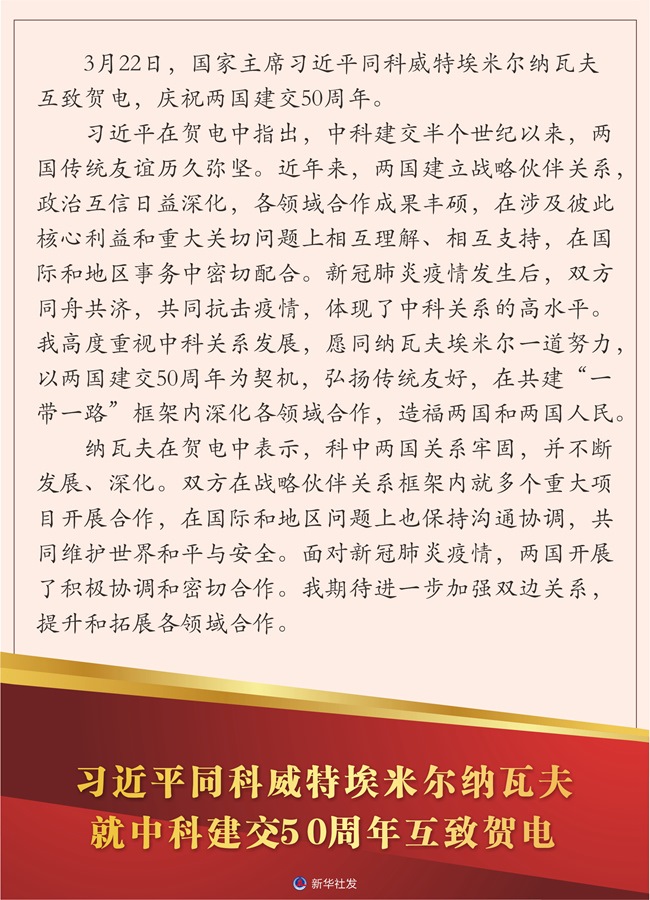 新華社北京3月22日電 3月22日,國家主席習近平同科威特埃米爾納瓦夫互致賀電,慶祝兩國建交50周年。