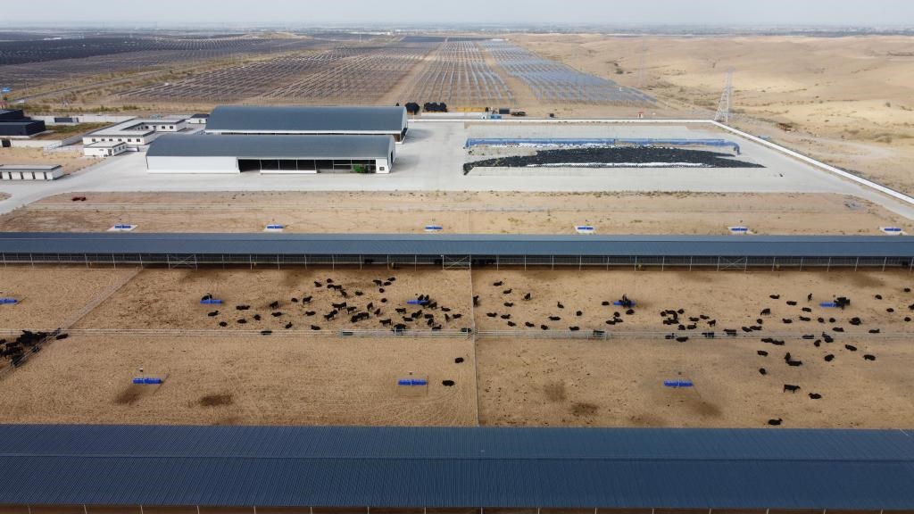 “這是我們在光伏基地打造的循環(huán)經(jīng)濟項目。”中畜科技有限公司肉牛標(biāo)準(zhǔn)化養(yǎng)殖場負(fù)責(zé)人石龍說,養(yǎng)殖場肉牛產(chǎn)生的糞便可以作為光伏基地板間種植作物的肥料,改善沙地土質(zhì)的同時還能促進作物生長,而這些作物又能作為飼料供應(yīng)養(yǎng)殖場,循環(huán)發(fā)展的同時還能促進沙漠生態(tài)改善。