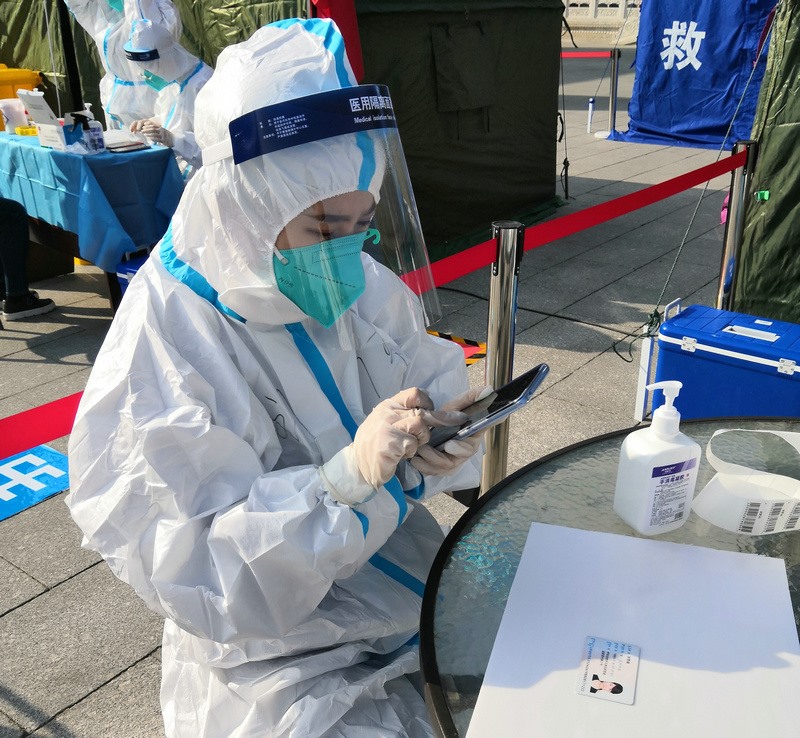 “昨天分配的任務(wù)是信息采集,因為第二輪核酸檢測要使用新的采集系統(tǒng),所以今天早晨7:00到崗后,大家開始學(xué)習(xí)信息采集系統(tǒng)的使用。信息采集不能出任何差錯,每一個信息采集員都很緊張,謹(jǐn)慎操作每一步?!痹诤艉秃铺厥杏袢獏^(qū)大召社區(qū)核酸檢測點參加志愿服務(wù)的張華媛說,8:00準(zhǔn)時開始第二次核酸檢測,直到下午2:00換崗,連續(xù)6小時緊張謹(jǐn)慎的信息采集,中途沒有休息過,整個身體感覺有點僵了。雖然很累,但是能成為抗疫戰(zhàn)士中的一員,和醫(yī)護(hù)人員、社區(qū)工作者及其他志愿者一起為呼和浩特抗疫貢獻(xiàn)自己的一份力,是一件非常有意義的事。