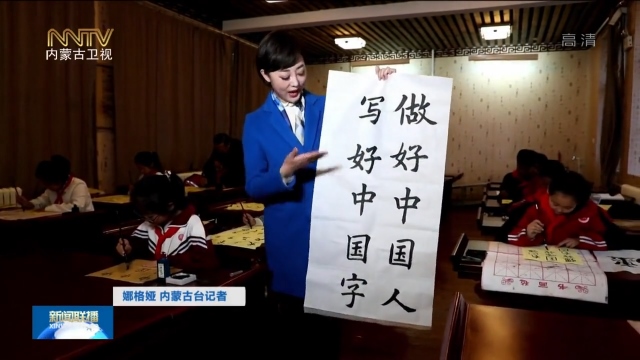 娜格婭 內(nèi)蒙古臺(tái)記者:做好中國人,寫好中國字,你能想到我手中的這些字,是一個(gè)四年級(jí)小朋友寫的嗎?我現(xiàn)在是在呼和浩特鋼鐵路第二小學(xué)的興趣課上,學(xué)生們正在學(xué)習(xí)寫毛筆字,一筆一劃傳承書法文化,一撇一捺書寫著愛國情懷。像這樣的興趣課每周有一次。