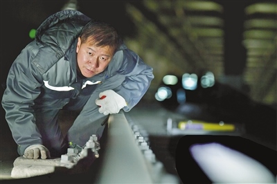 昏暗、逼仄的軌行區(qū)內(nèi),軌道檢修師們焊接鋼軌時迸發(fā)的火花顯得格外耀眼,維修軌道設(shè)備時敲擊鋼軌的聲音顯得格外清脆、響亮。據(jù)田智宏介紹,一個軌道檢修師每次夜間軌行區(qū)的巡檢作業(yè)大約要走7公里路程。他和工友們每天要檢查數(shù)千個部件,測量上百個數(shù)據(jù),其中一項重要巡檢工作就是檢查扣件和接頭聯(lián)結(jié)零件的組成部件是否安裝牢固,螺栓是否松動。他指了指自己腳上的鞋說:“我們的檢修對象不僅笨重且危險性較高,為了防止腳部受到傷害,鞋子都是特制的防砸絕緣鞋?!?/p>