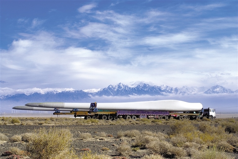 運送風電葉片的車輛行駛在阿拉善戈壁。馬建荃 攝