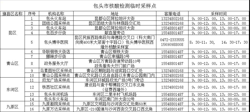 為方便廣大市民出行,做好“愿檢盡檢”人員的核酸檢測,提升核酸檢測效率,現(xiàn)公布包頭市29個(gè)24小時(shí)核酸采樣檢測機(jī)構(gòu)和16個(gè)臨時(shí)核酸采樣點(diǎn),供廣大市民選擇。