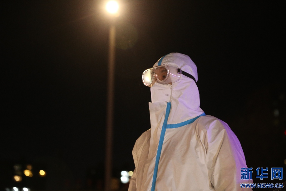 上午的樣本轉(zhuǎn)運(yùn)工作告一段落,籍東斌和工作人員在指定地點(diǎn)脫掉防護(hù)服,進(jìn)行全身消殺。新華網(wǎng)發(fā) 李倩攝