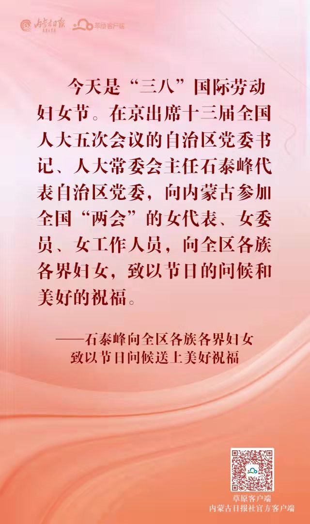 今天是“三八”國際勞動?jì)D女節(jié)。在京出席十三屆全國人大五次會議的自治區(qū)黨委書記、人大常委會主任石泰峰代表自治區(qū)黨委,向內(nèi)蒙古參加全國“兩會”的女代表、女委員、女工作人員,向全區(qū)各族各界婦女,致以節(jié)日的問候和美好的祝福。(內(nèi)蒙古日報(bào)社融媒體記者 章奎)