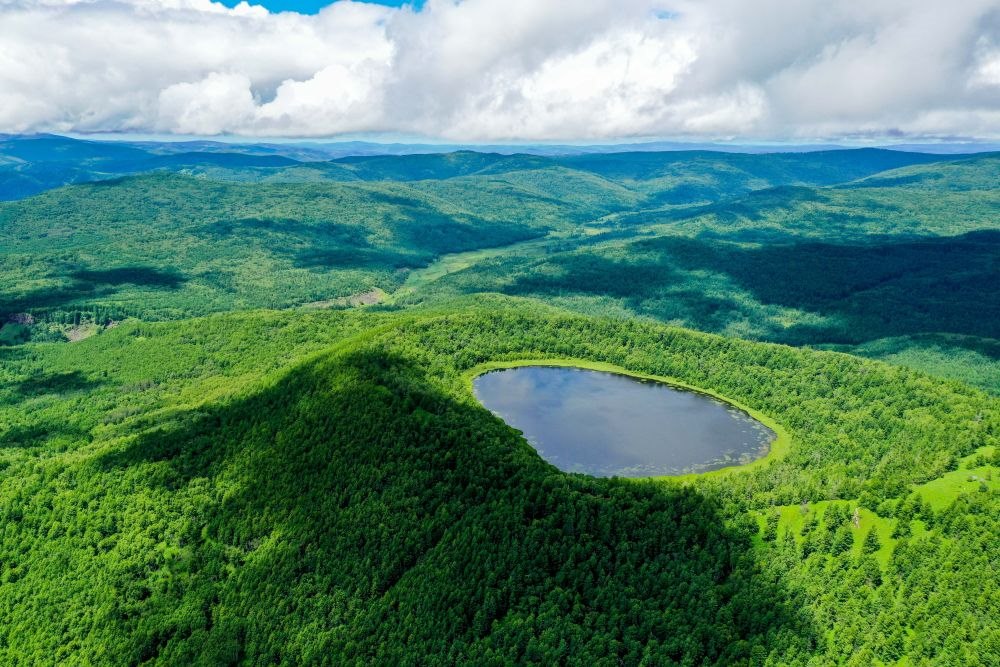 這是內(nèi)蒙古阿爾山天池風(fēng)光(2021年7月14日攝,無(wú)人機(jī)照片)。新華社記者連振攝