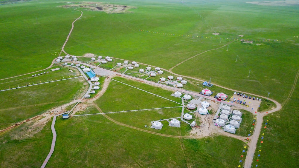 這是內(nèi)蒙古錫林郭勒盟寶力根蘇木的一處那達(dá)慕會(huì)場(chǎng)(2017年7月21日攝,無(wú)人機(jī)照片)。新華社記者連振攝