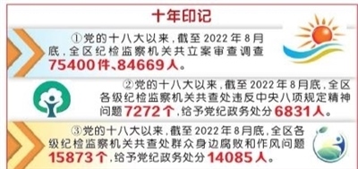 數(shù)據(jù)顯示,黨的十八大以來,截至2022年8月底,全區(qū)紀(jì)檢監(jiān)察機關(guān)立案審查調(diào)查75400件、84669人,做到有腐必反、除惡務(wù)盡,推動政治生態(tài)持續(xù)向上向好。