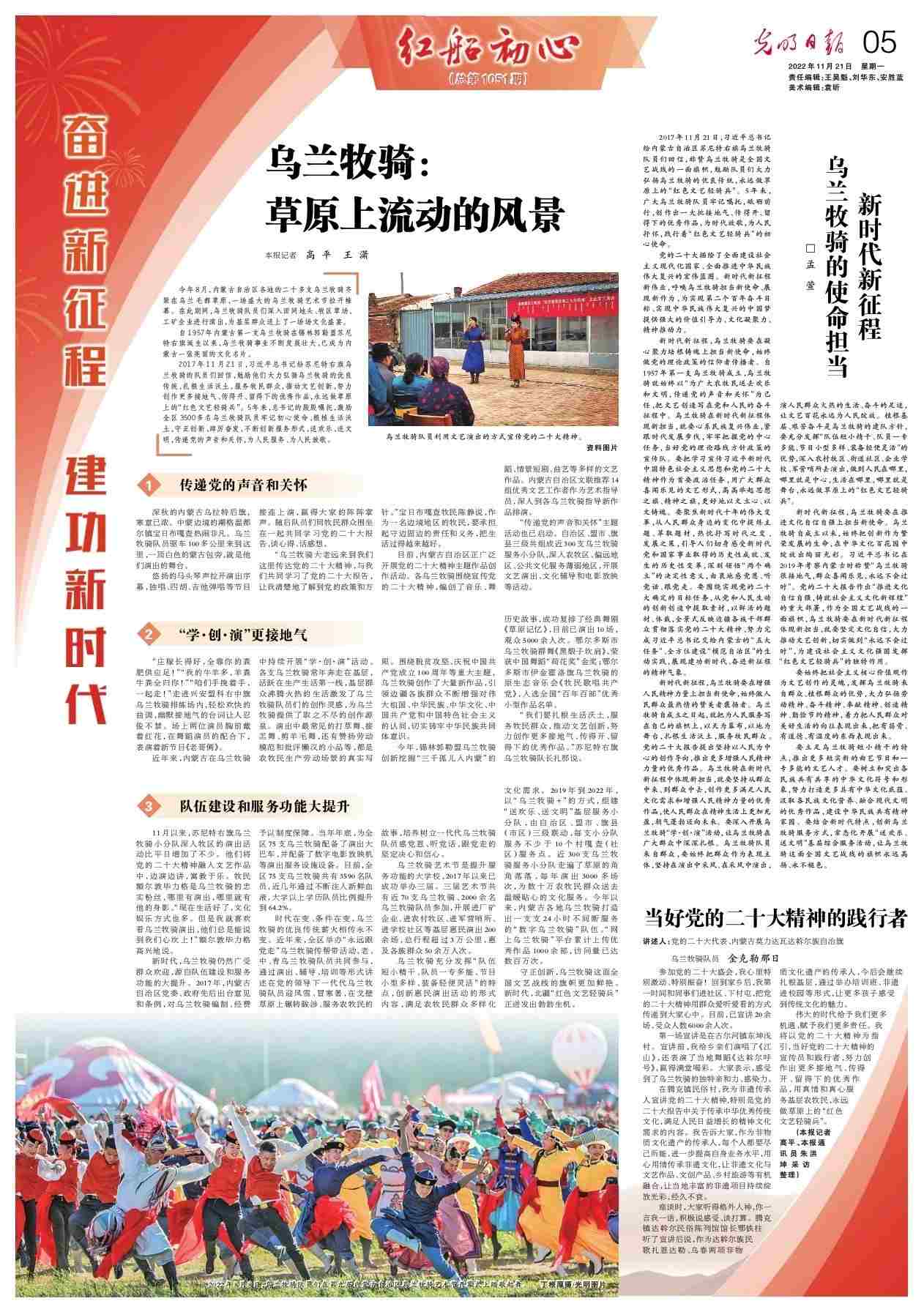 2017年11月21日,習(xí)近平總書記給蘇尼特右旗烏蘭牧騎的隊員們回信,勉勵他們大力弘揚烏蘭牧騎的優(yōu)良傳統(tǒng),扎根生活沃土,服務(wù)牧民群眾,推動文藝創(chuàng)新,努力創(chuàng)作更多接地氣、傳得開、留得下的優(yōu)秀作品,永遠(yuǎn)做草原上的“紅色文藝輕騎兵”。5年來,總書記的殷殷囑托,激勵全區(qū)3500多名烏蘭牧騎隊員牢記初心使命、根植生活沃土,守正創(chuàng)新、踔厲奮發(fā),不斷創(chuàng)新服務(wù)形式,送歡樂、送文明,傳遞黨的聲音和關(guān)懷,為人民服務(wù)、為人民放歌。