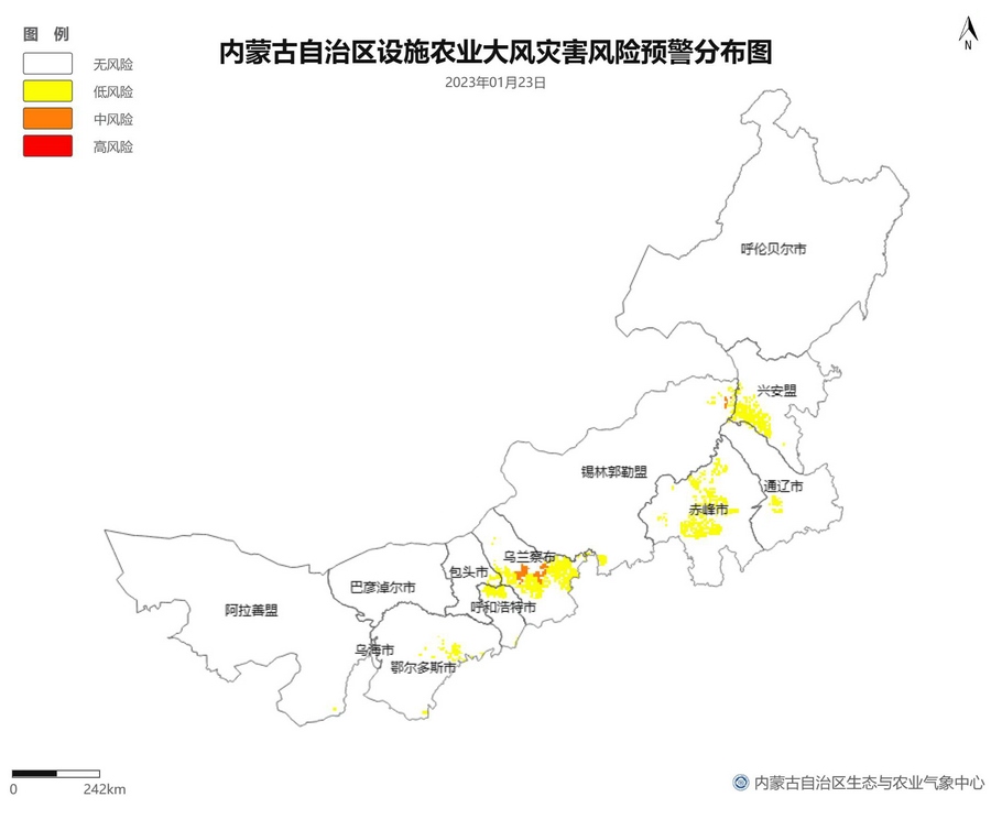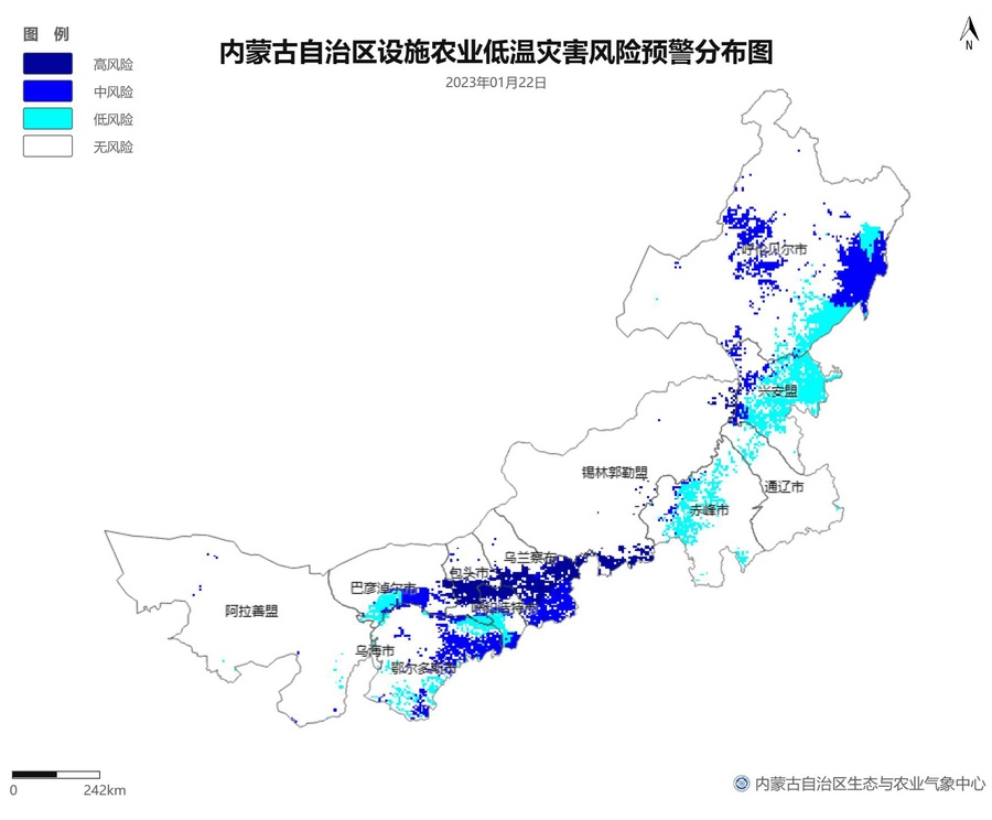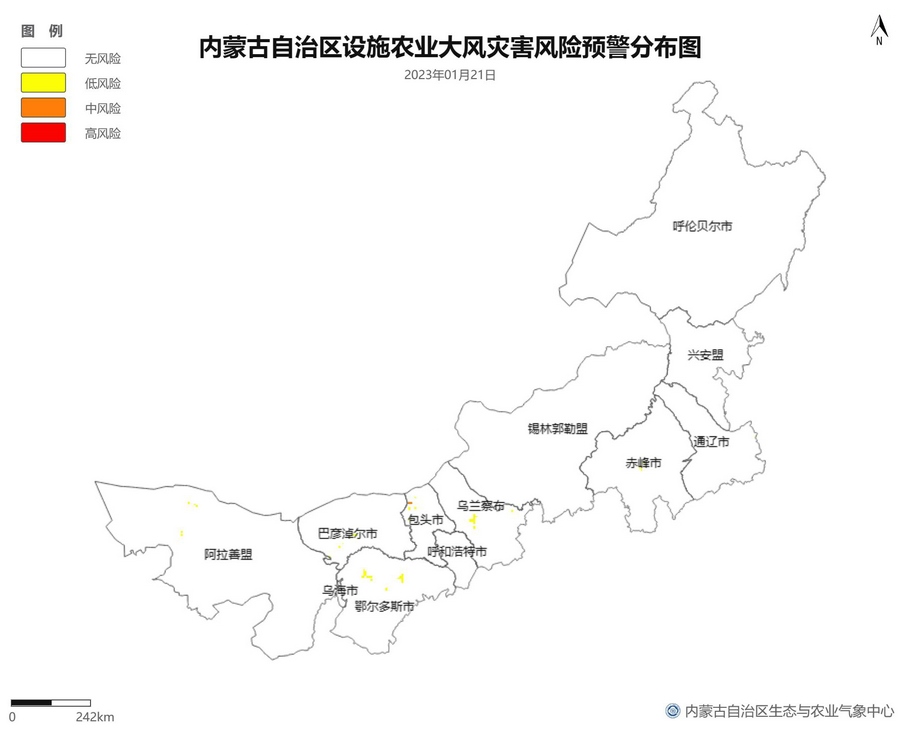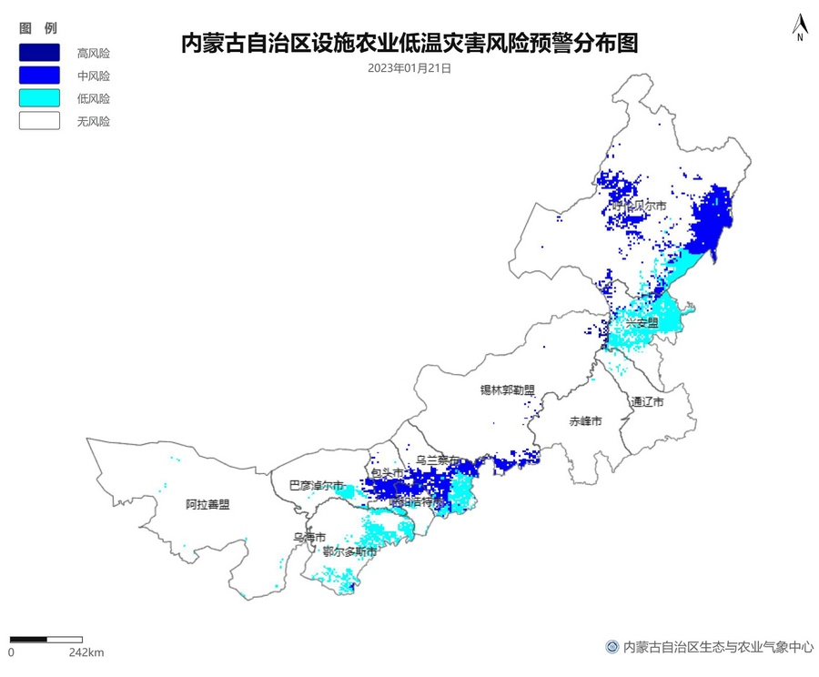 根據(jù)智能網(wǎng)格預(yù)報數(shù)據(jù),結(jié)合設(shè)施農(nóng)業(yè)低溫災(zāi)害和風(fēng)災(zāi)指標,1月21日至23日,呼倫貝爾市東南部、東南部偏西地區(qū)為設(shè)施農(nóng)業(yè)低溫災(zāi)害低風(fēng)險地區(qū),東北部中部及東部、中部偏南大部、西部偏東部分地區(qū)為設(shè)施農(nóng)業(yè)低溫災(zāi)害中或高風(fēng)險地區(qū),低溫災(zāi)害將導(dǎo)致作物生長緩慢和受凍;21至23日,東南部部分地區(qū)、中部偏西南局部地區(qū)及鄂爾多斯市零星地區(qū)為設(shè)施農(nóng)業(yè)風(fēng)災(zāi)低風(fēng)險地區(qū),其中,22日鄂爾多斯市北部零星地區(qū)、23日錫林郭勒盟東部零星地區(qū)、烏蘭察布市中部局部地區(qū)為設(shè)施農(nóng)業(yè)風(fēng)災(zāi)中或高風(fēng)險地區(qū),風(fēng)災(zāi)易造成溫室結(jié)構(gòu)受損。