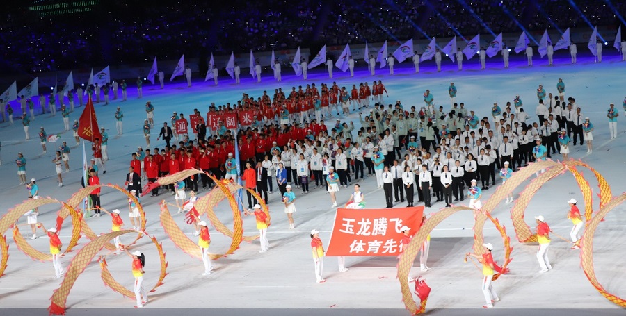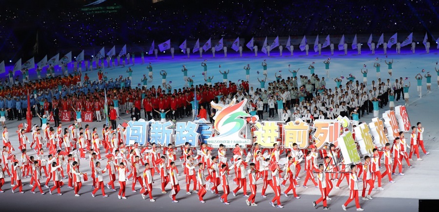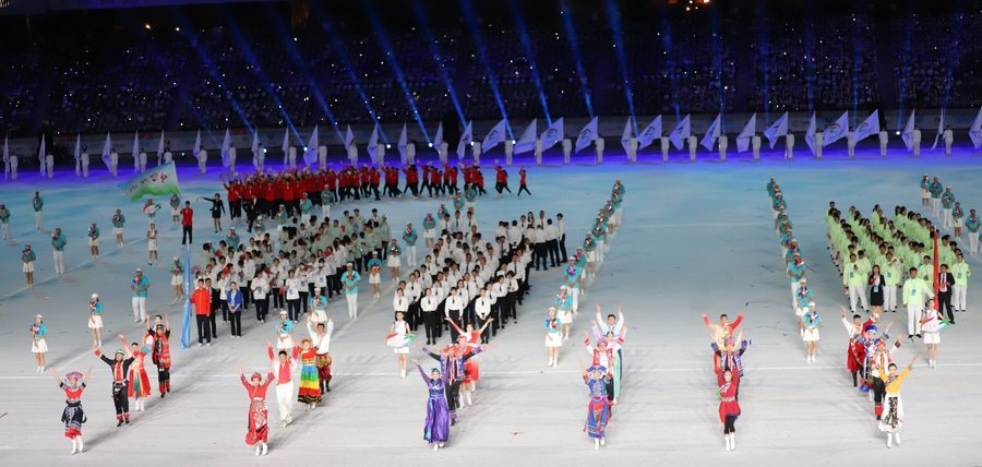 入場(chǎng)儀式結(jié)束后,在雄壯的國(guó)歌聲中,鮮艷的五星紅旗冉冉升起,在體育中心上空迎風(fēng)飄揚(yáng)。期盼的眼神,真摯的祝福,蕩漾在每個(gè)人的心間。開(kāi)幕式文體展演隨后正式拉開(kāi)帷幕。