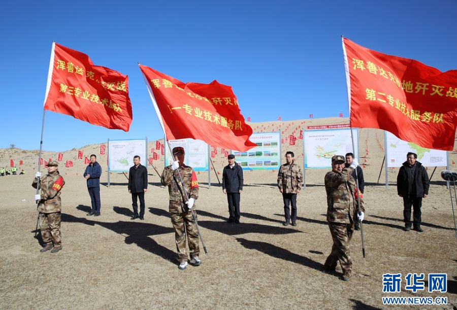 ??參會(huì)人員與專業(yè)技術(shù)服務(wù)隊(duì)以及社會(huì)各界代表,在渾善達(dá)克沙地設(shè)置沙障。新華網(wǎng) 石毅攝