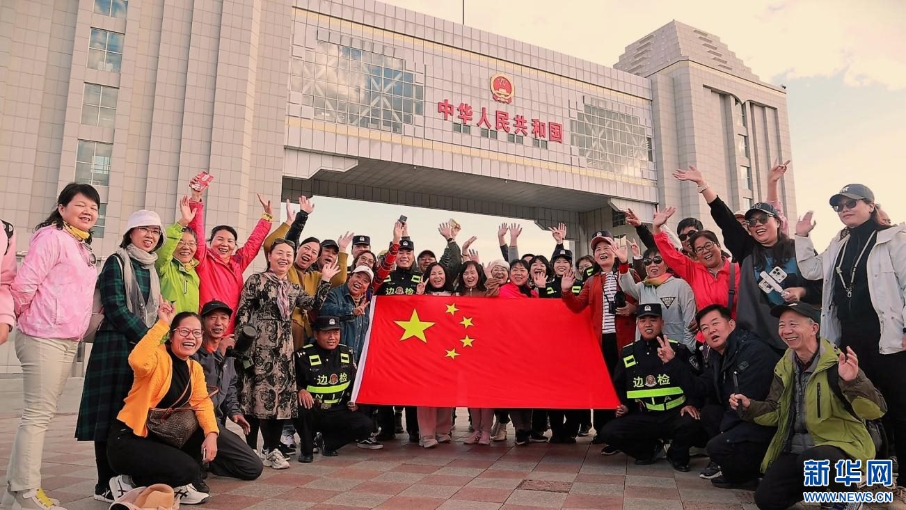 游客在滿洲里國(guó)門下合影。新華網(wǎng)發(fā) (李新軍 攝)