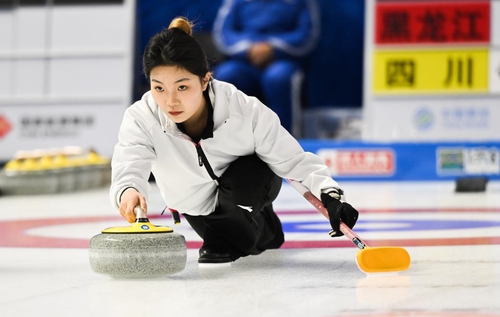 1月17日,四川隊選手崔欣然在第十四屆全國冬季運動會冰壺青年組比賽中擲壺。新華社記者 劉磊 攝