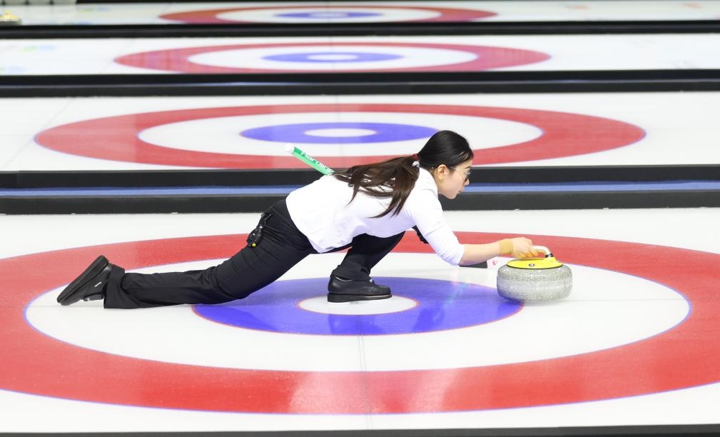 ??1月12日,文馨悅在比賽中擲壺。在第十四屆全國冬季運動會冰壺青年組混雙金牌賽中,黑龍江隊選手李思霖/文馨悅奪得金牌。新華社記者 王楷焱 攝