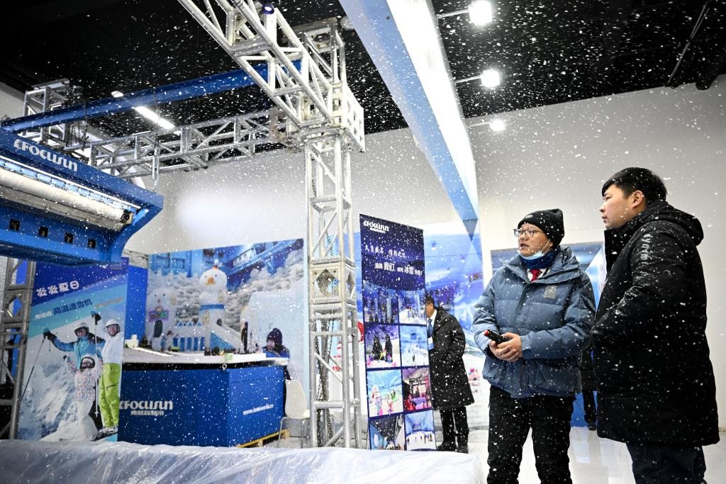 ??2023年12月16日,市民在展銷會上觀看飄雪機飄雪。當日,2023年首屆呼倫貝爾·海拉爾冰雪產(chǎn)品冬季展銷會在內(nèi)蒙古呼倫貝爾市海拉爾區(qū)開幕。新華社記者 貝赫 攝