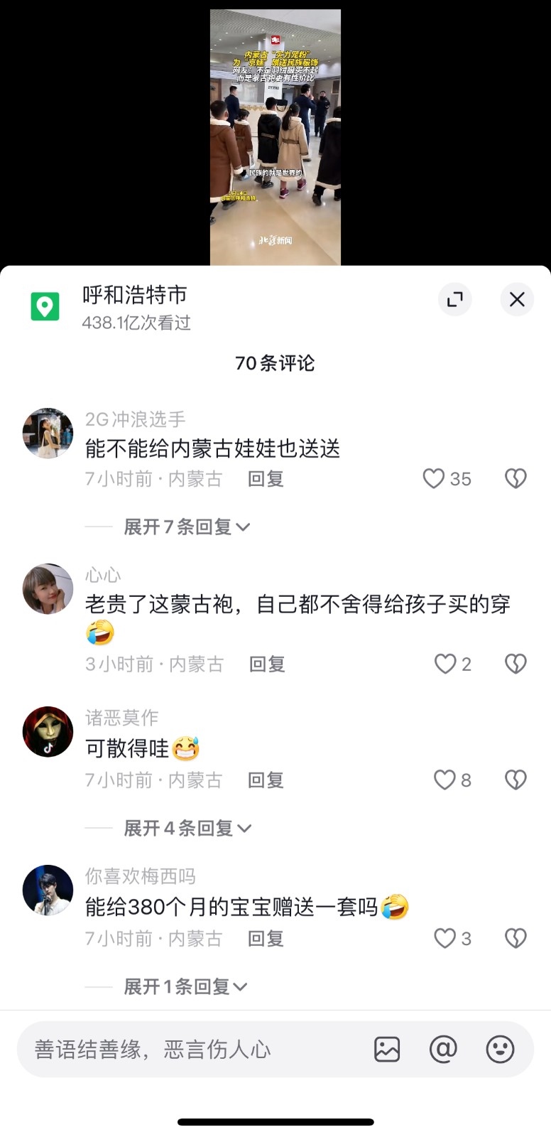 內(nèi)蒙古為了招待北京來(lái)的萌娃們,直接送了溫暖的蒙古袍,對(duì)于這些,本地人的反應(yīng)是:“能不能給內(nèi)蒙古娃娃也送送”“能給380個(gè)月的寶寶贈(zèng)送一套嗎”。還有本地人表示,“蒙古袍子就送了”“老貴了這蒙古袍,自己都不舍得給孩子買(mǎi)的穿”。