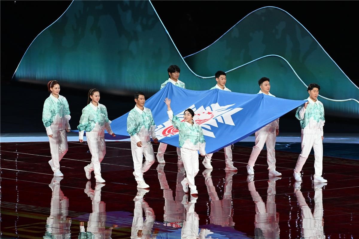 中華人民共和國第十四屆冬季運動會會旗入場。