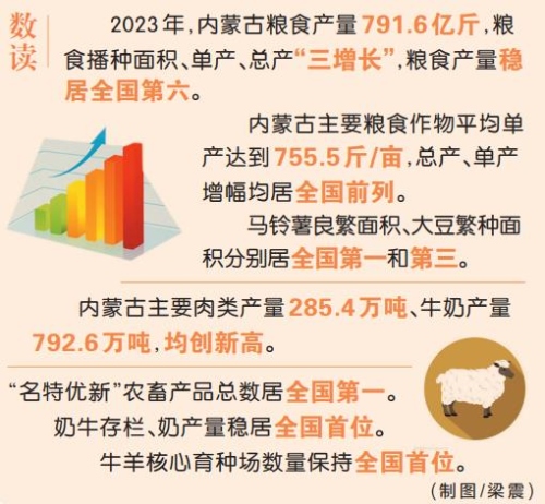 五谷者,萬民之命,國之重寶。2023年,內(nèi)蒙古以糧食產(chǎn)量791.6億斤迎來了第二十個(gè)豐收年。糧食播種面積、單產(chǎn)、總產(chǎn)“三增長(zhǎng)”,糧食產(chǎn)量穩(wěn)居全國第六。全區(qū)主要肉類產(chǎn)量285.4萬噸、牛奶產(chǎn)量792.6萬噸,均創(chuàng)新高?!懊貎?yōu)新”農(nóng)畜產(chǎn)品總數(shù)居全國第一,“內(nèi)蒙古味道”香飄萬里。