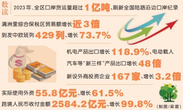 2023年,全區(qū)口岸貨運(yùn)量超過1億噸、刷新全國陸路沿邊口岸紀(jì)錄;滿洲里綜合保稅區(qū)貿(mào)易額增長近3倍;到發(fā)中歐班列429列、增長73.7%;機(jī)電產(chǎn)品出口增長118.9%、電動載人汽車等“新三樣”產(chǎn)品出口增長48倍;新設(shè)外商投資企業(yè)167家、增長3.2倍;實(shí)際使用外資55.8億元、增長61.5%;跨境人民幣收付金額2584.2億元、增長99.8%……