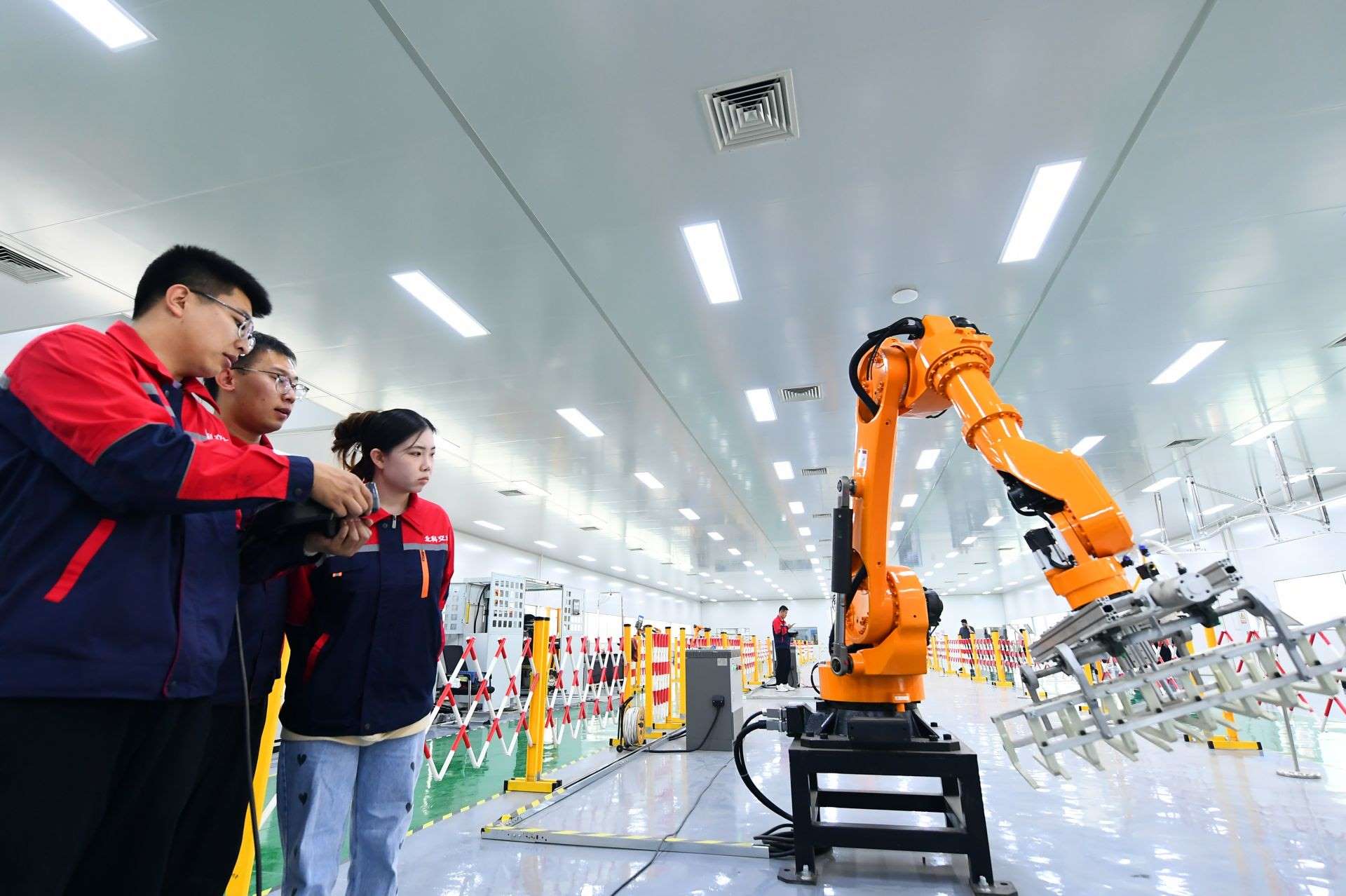 包頭稀土高新技術(shù)產(chǎn)業(yè)開(kāi)發(fā)區(qū)高新技術(shù)特色產(chǎn)業(yè)基地北科交大機(jī)器人展廳,工作人員正在調(diào)試碼垛轉(zhuǎn)運(yùn)六軸機(jī)器人。草原全媒記者金泉攝