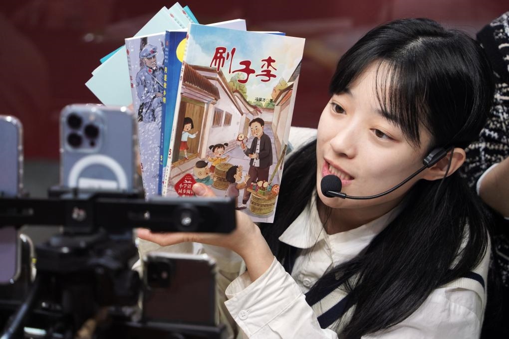??1月11日,一名主播在2024北京圖書訂貨會直播推介圖書。新華社記者 潘旭 攝