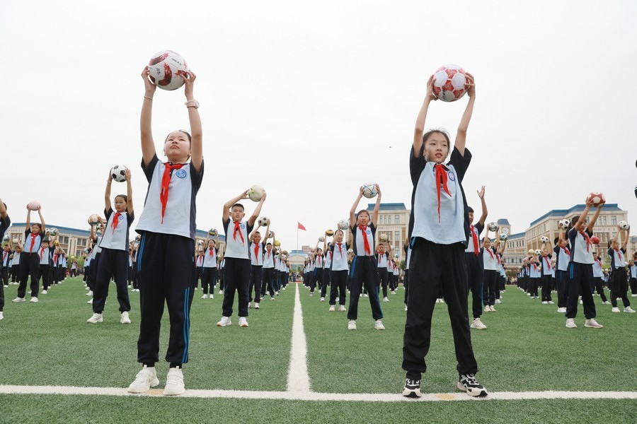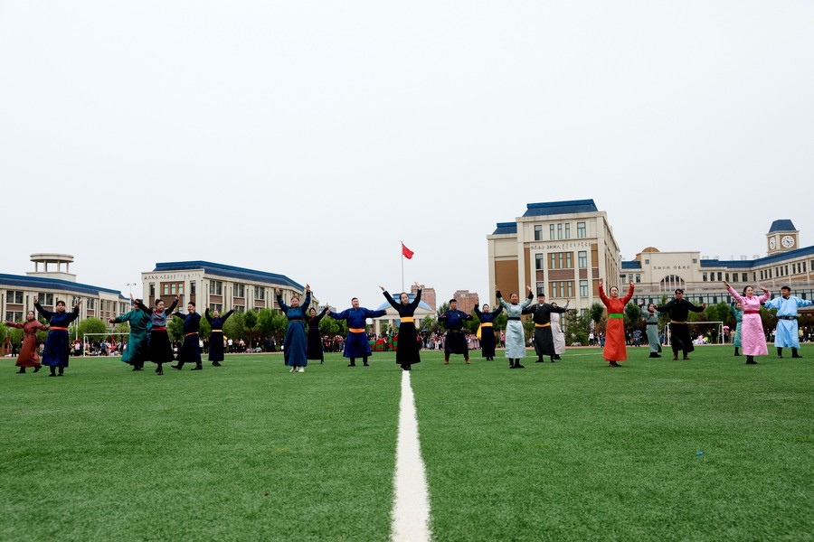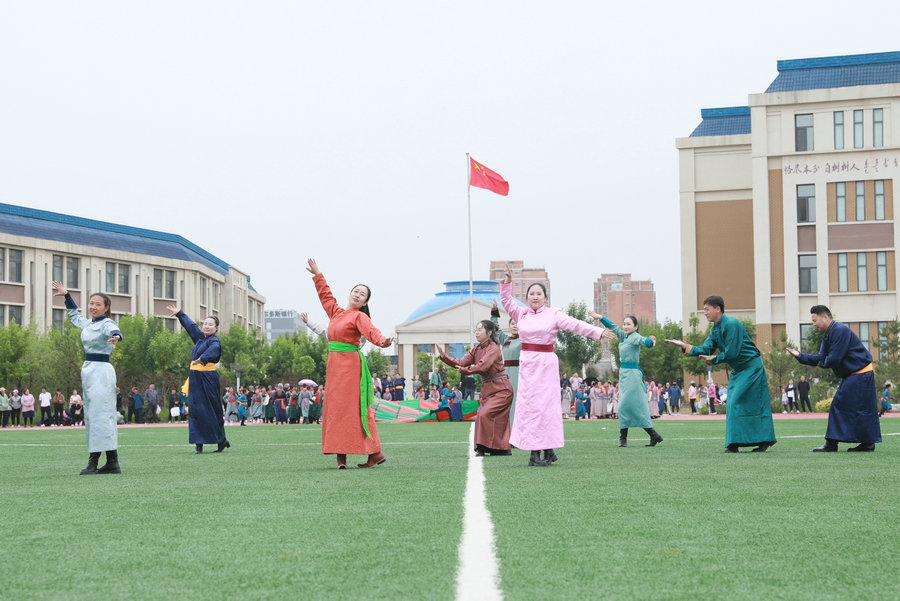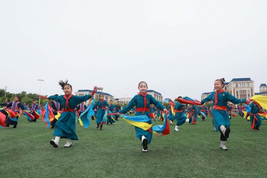 北疆新聞鄂爾多斯5月29日電(記者 張楊)“我們以鑄牢中華民族共同體意識(shí)為主線,創(chuàng)建了4個(gè)‘千人文化’特色課程,分別為千人足球、千人《江格爾》、千人筷子舞、千人棋類(lèi)?!?月29日,內(nèi)蒙古鄂爾多斯鄂托克前旗“美育潤(rùn)心·筑夢(mèng)同行”第十四屆中小學(xué)師生藝術(shù)節(jié)暨慶“六一”國(guó)際兒童節(jié)多彩大課間操展示活動(dòng),在鄂托克前旗第一小學(xué)舉行。該校校長(zhǎng)阿拉騰達(dá)來(lái)接受記者采訪時(shí)表示,創(chuàng)建這個(gè)特色課程的主要目的,是培養(yǎng)孩子多方面的才藝,為祖國(guó)培養(yǎng)有用之才。