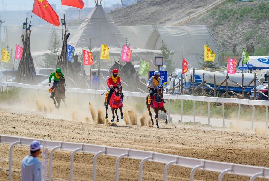 7月13日下午,內(nèi)蒙古錫林浩特馬都核心區(qū)賽馬場(chǎng),錫林浩特蒙古馬積分賽1000米速度賽和15公里接力賽正在這里輪番進(jìn)行,比賽現(xiàn)場(chǎng),選手們策馬奔騰,激戰(zhàn)正酣。