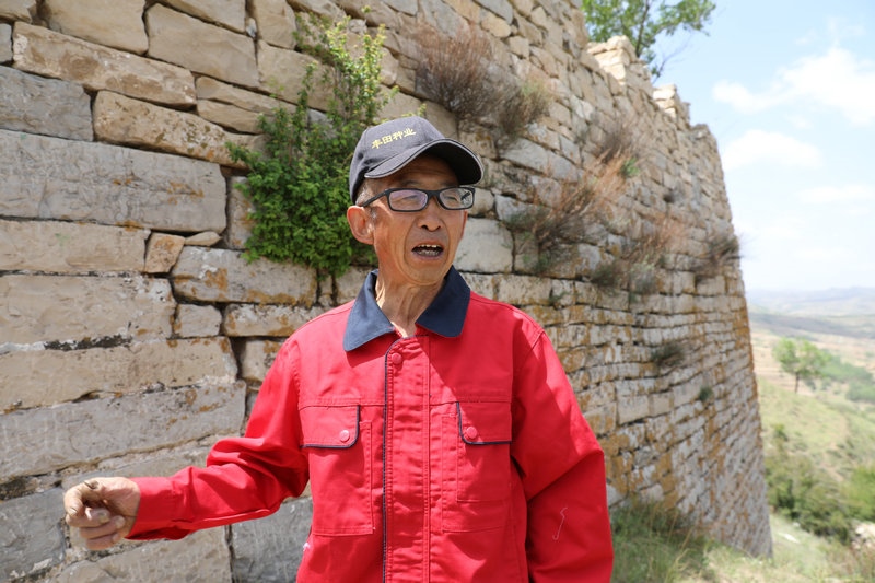 “家在長(zhǎng)城腳下,從小就與長(zhǎng)城為伴,那時(shí)長(zhǎng)城上鋪滿(mǎn)青磚,外側(cè)以青石砌筑?!敝x軍邊走邊說(shuō),“之前由于保護(hù)長(zhǎng)城的意識(shí)薄弱,村里人把長(zhǎng)城上的磚石拆下砌筑窯洞。青石有的太重,只能將其鑿分為二,兩人合力用杠才能抬走?!?/p>