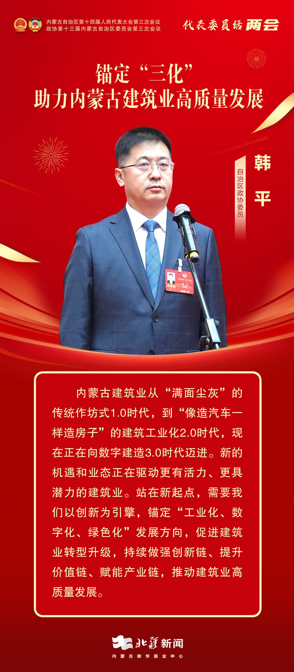 北疆新聞呼和浩特1月13日電(記者 張?chǎng)?李姝廷)委員通道,通民心、道發(fā)展。1月13日上午,自治區(qū)兩會(huì)首場(chǎng)“委員通道”正式開啟。自治區(qū)政協(xié)委員,興泰建設(shè)集團(tuán)有限公司黨委書記、董事長(zhǎng)韓平圍繞“建筑業(yè)高質(zhì)量發(fā)展”的內(nèi)容建真言、獻(xiàn)良策。