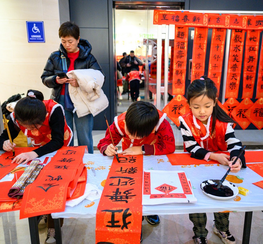 小朋友也參與到寫春聯(lián)的活動中