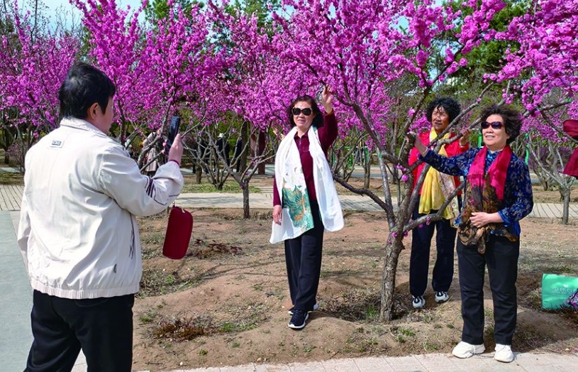 走進(jìn)植物園,道路兩側(cè)的榆葉梅競(jìng)相綻放,粉紅色的花朵層層疊疊掛滿枝頭,形成一片爛漫花海。從浙江來(lái)的游客李筱正用手機(jī)記錄美景:“原本擔(dān)心錯(cuò)過(guò)北方花期,沒(méi)想到這里的榆葉梅開(kāi)得這么漂亮,完全不輸江南的春天。”