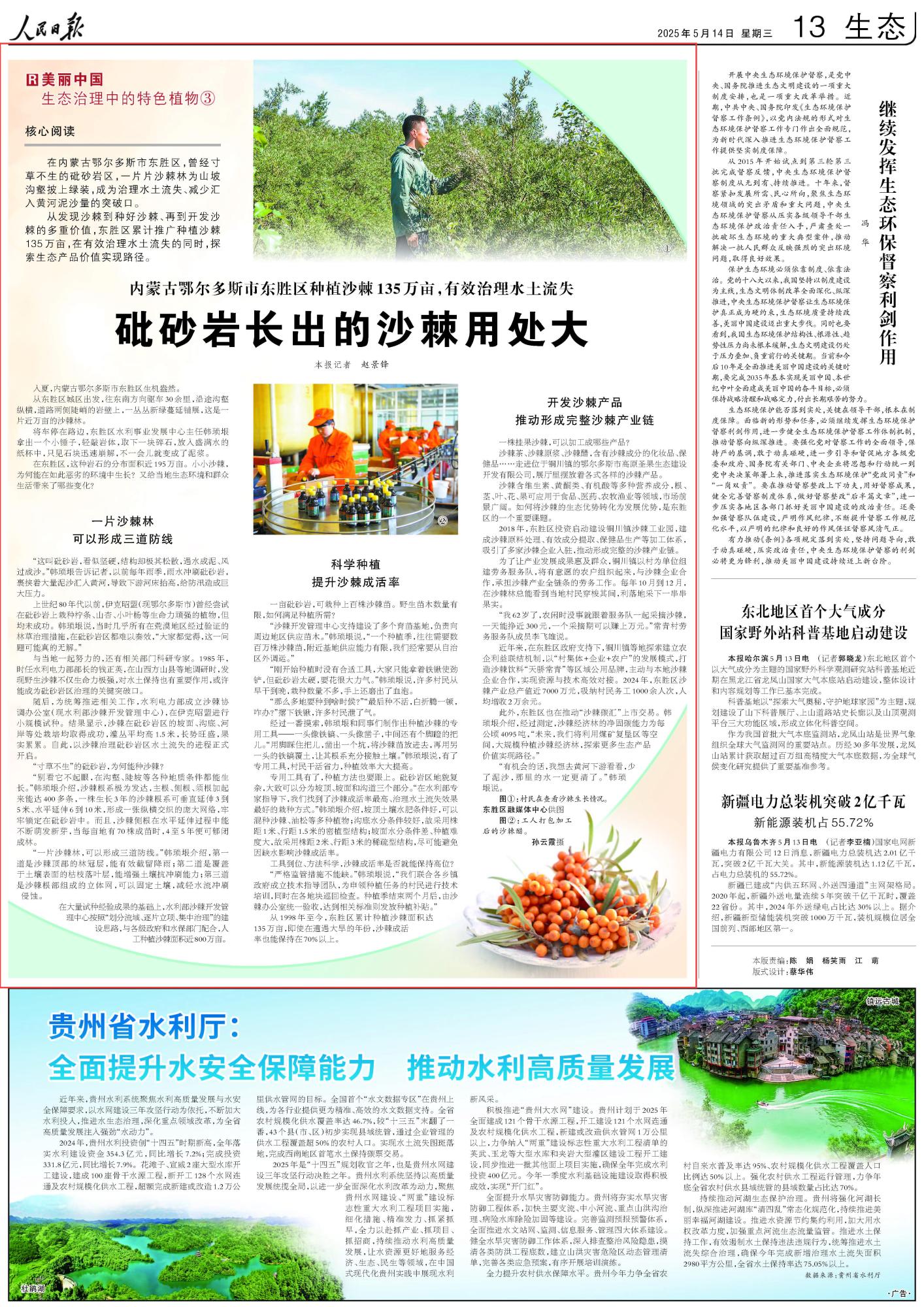 2025年5月14日《人民日報》第13版刊發(fā)了《內蒙古鄂爾多斯市東勝區(qū)種植沙棘135萬畝,有效治理水土流失 砒砂巖長出的沙棘用處大》的文章,報道了內蒙古鄂爾多斯市東勝區(qū)累計推廣種植沙棘135萬畝,在有效治理水土流失的同時,探索生態(tài)產品價值實現路徑。