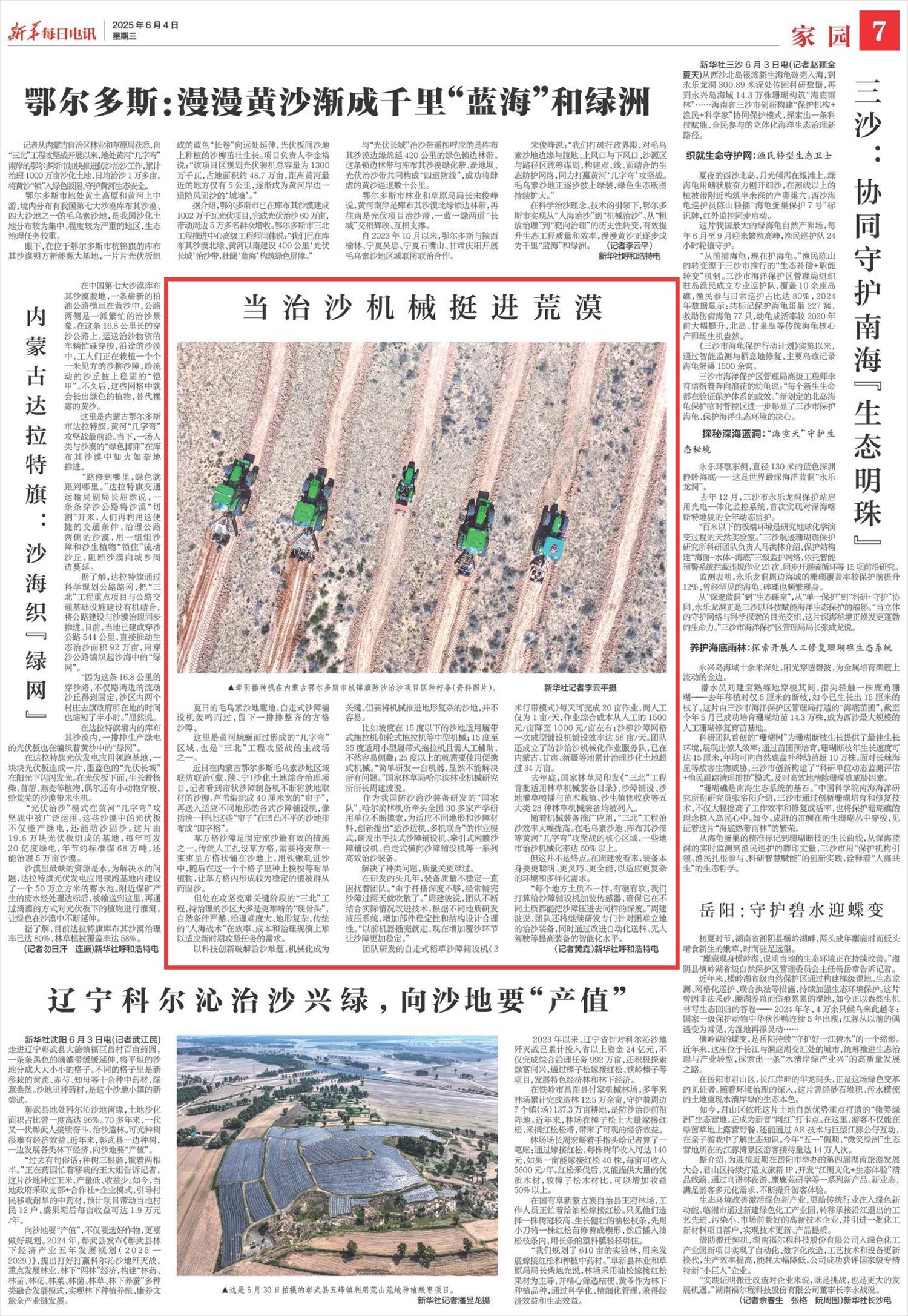 2025年6月4日,《新華每日電訊》第7版刊發(fā)題為《當治沙機械挺進荒漠》一文,報道了內(nèi)蒙古鄂爾多斯毛烏素沙地區(qū)域聯(lián)防聯(lián)治(蒙、陜、寧)沙化土地綜合治理項目創(chuàng)新應(yīng)用系列機械化沙障鋪設(shè)裝備,適應(yīng)復(fù)雜地形,“三北”工程治沙效率大幅提高。毛烏素沙地、庫布其沙漠等黃河“幾字彎”攻堅戰(zhàn)的核心區(qū)域,一些地市治沙機械化率達60%以上。