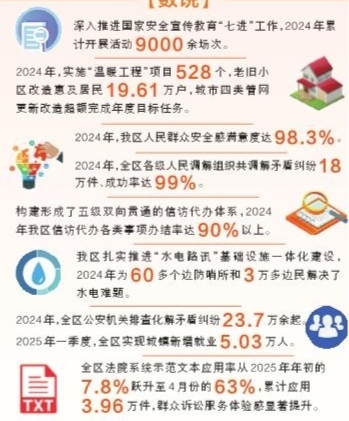 2024年,全區(qū)各級(jí)人民調(diào)解組織共調(diào)解矛盾糾紛18萬(wàn)件、成功率達(dá)99%。全區(qū)信訪代辦各類事項(xiàng)辦結(jié)率達(dá)90%以上,一大批群眾急難愁盼事項(xiàng)得到及時(shí)就地解決。