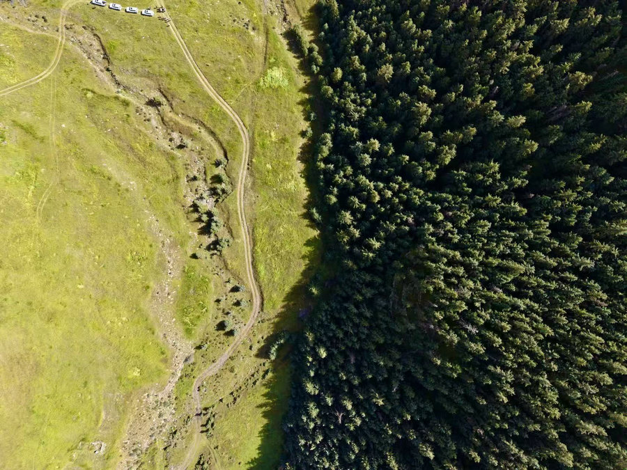 航拍視角下的山林與草甸過(guò)渡帶