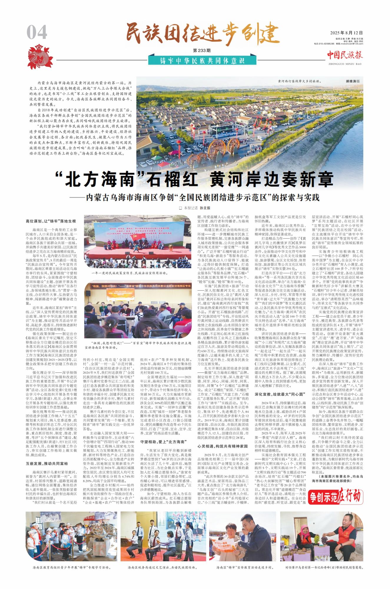 2025年8月12日,《中國民族報》第4版刊發(fā)整版文章《“北方海南”石榴紅 黃河岸邊奏新章——內(nèi)蒙古烏海市海南區(qū)爭創(chuàng)“全國民族團結(jié)進步示范區(qū)”的探索與實踐》,報道了自2018年成功創(chuàng)建“自治區(qū)民族團結(jié)進步示范區(qū)”后,內(nèi)蒙古烏海市海南區(qū)各族干部群眾在爭創(chuàng)“全國民族團結(jié)進步示范區(qū)”的新征程上凝心聚力再出發(fā),共同唱響民族團結(jié)進步主旋律。