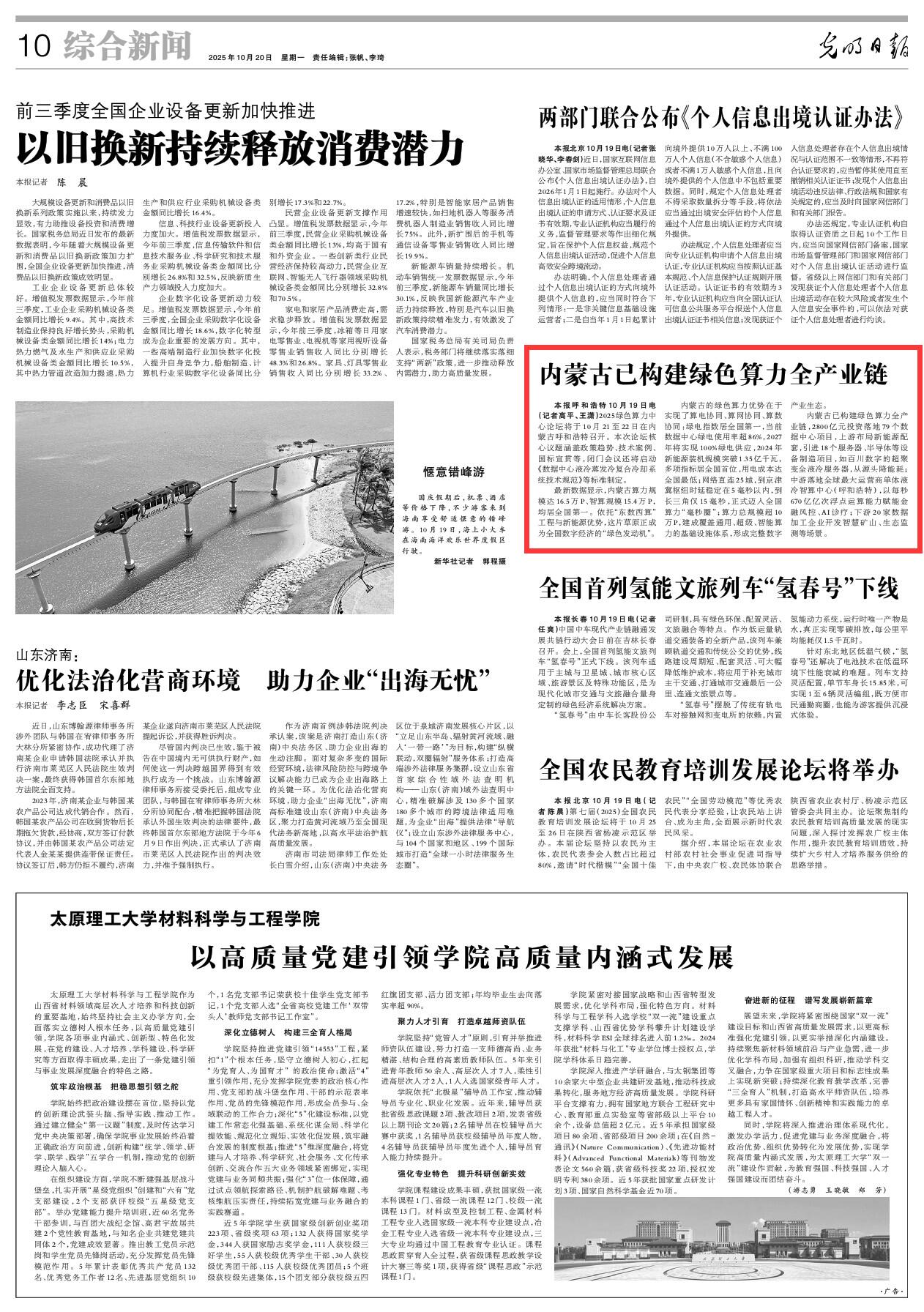 2025年10月20日《光明日?qǐng)?bào)》第10版刊發(fā)了《內(nèi)蒙古已構(gòu)建綠色算力全產(chǎn)業(yè)鏈》的文章,報(bào)道了2025綠色算力中心論壇將于10月21至22日在內(nèi)蒙古呼和浩特召開(kāi)。最新數(shù)據(jù)顯示,內(nèi)蒙古算力規(guī)模達(dá)16.5萬(wàn)P、智算規(guī)模15.4萬(wàn)P,均居全國(guó)第一。依托“東數(shù)西算”工程與新能源優(yōu)勢(shì),這片草原正成為全國(guó)數(shù)字經(jīng)濟(jì)的“綠色發(fā)動(dòng)機(jī)”。