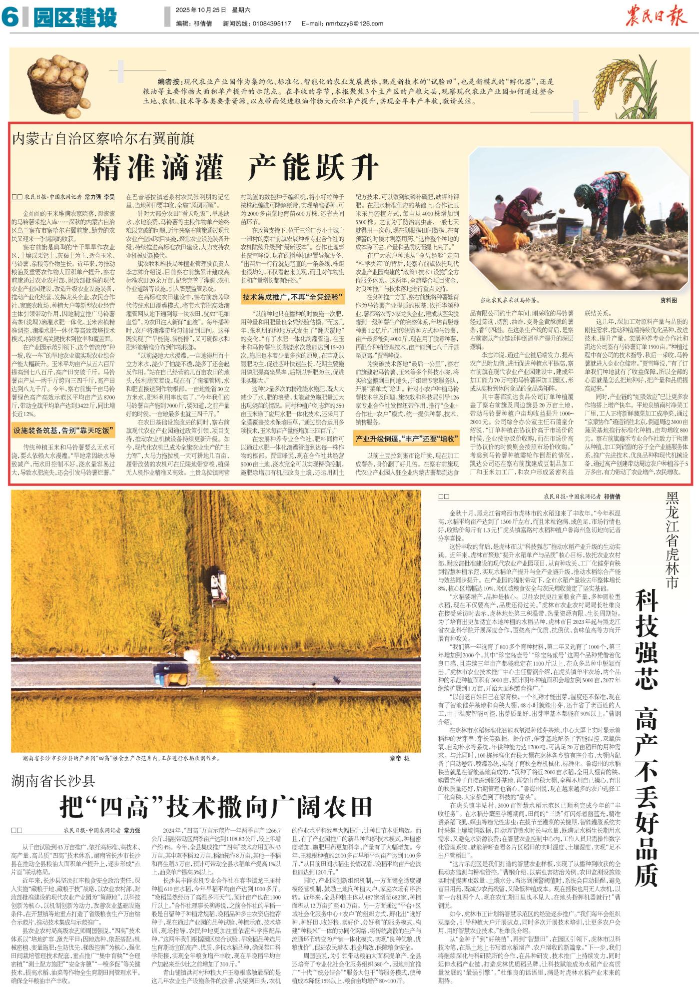 2025年10月25日,《農民日報》第6版刊發(fā)題為《內蒙古自治區(qū)察哈爾右翼前旗:精準滴灌 產能躍升》的文章,報道了內蒙古烏蘭察布市察哈爾右翼前旗通過現(xiàn)代農業(yè)產業(yè)園推廣滴灌水肥一體化等技術,推動玉米、馬鈴薯單產大幅提升,成功實現(xiàn)從“靠天吃飯”到科技增收的轉變。