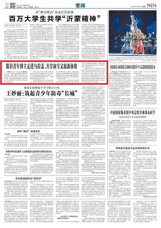 2026年1月11日,《中國青年報》第2版刊發(fā)題為《跟著青年博主走進烏拉蓋,共享冰雪文旅新體驗》的文章,報道了1月10日,內蒙古自治區(qū)錫林郭勒盟烏拉蓋管理區(qū)“歌游內蒙古 冰雪烏拉蓋”第三屆冰雪文旅主題活動在烏拉蓋九曲灣景區(qū)開幕。來自全國各地的游客、文旅達人約1萬人齊聚雪原,開啟一場草原特色的冬日文旅盛宴。