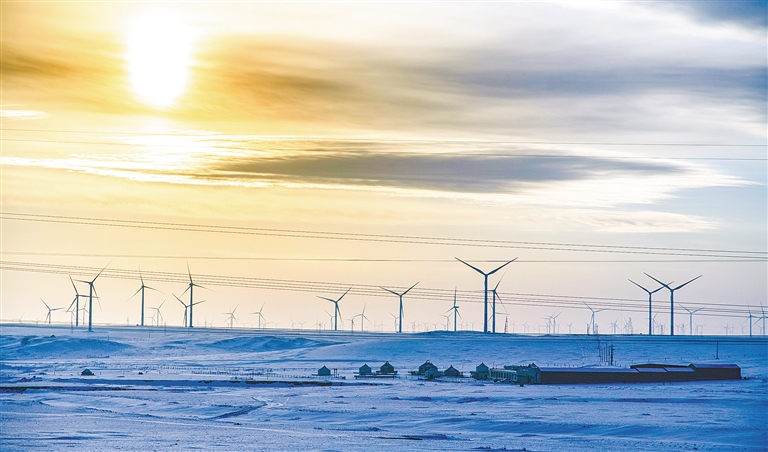 湛藍(lán)天幕之下,150座白色風(fēng)車如鋼鐵巨人般巍然矗立,巨大的風(fēng)機葉片迎風(fēng)轉(zhuǎn)動,劃破長風(fēng),發(fā)出低沉而均勻的呼嘯,與天地間的遼闊寂靜共鳴。