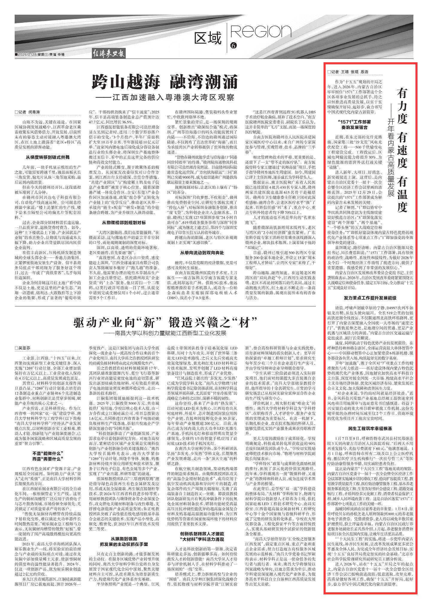 2026年1月28日《經(jīng)濟(jì)參考報(bào)》第6版刊發(fā)了《有力度 有速度 有溫度——開年看內(nèi)蒙古高質(zhì)量發(fā)展》的文章,報(bào)道了進(jìn)入2026年,站在“十五五”開局之年的起點(diǎn)上,內(nèi)蒙古自治區(qū)黨委十一屆十一次全會(huì)暨全區(qū)經(jīng)濟(jì)工作會(huì)議已擂響前進(jìn)戰(zhàn)鼓:銳意進(jìn)取,攻堅(jiān)克難,高質(zhì)量做好各項(xiàng)工作,確保“十五五”開好局、起好步,奮力書寫中國(guó)式現(xiàn)代化內(nèi)蒙古新篇章。