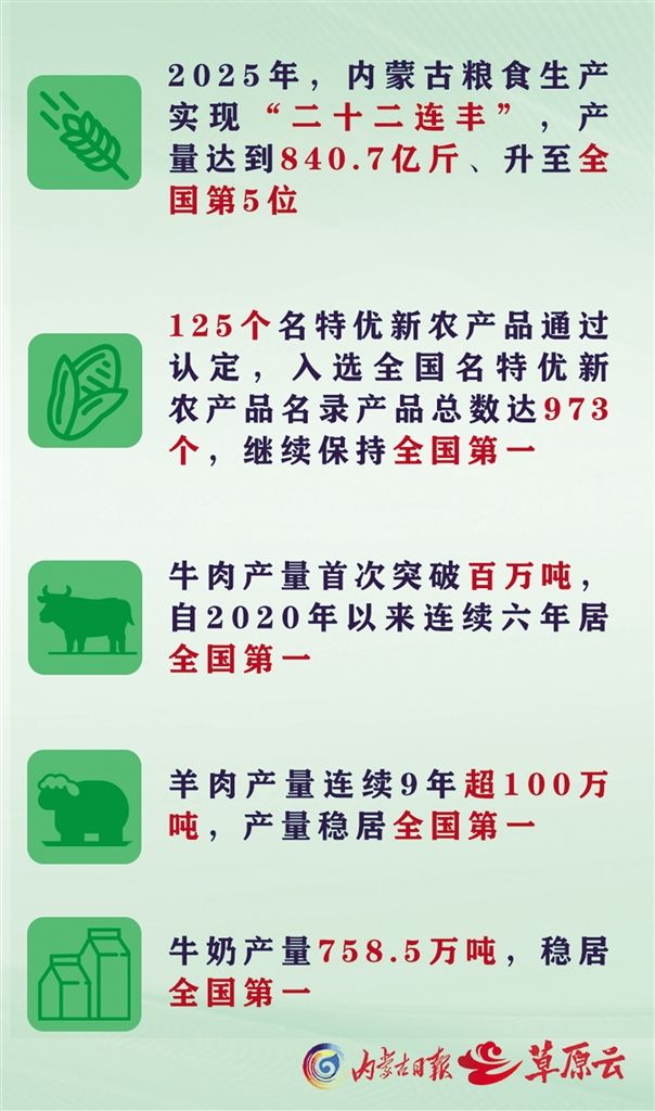 從河套平原的繁忙備耕到錫林郭勒草原的牛羊成群,再到敕勒川的奶香四溢,內(nèi)蒙古以“糧倉”更實(shí)、“肉庫”更足、“奶罐”更豐的堅(jiān)實(shí)底氣,扛起建設(shè)國家重要農(nóng)畜產(chǎn)品生產(chǎn)基地的使命擔(dān)當(dāng)。